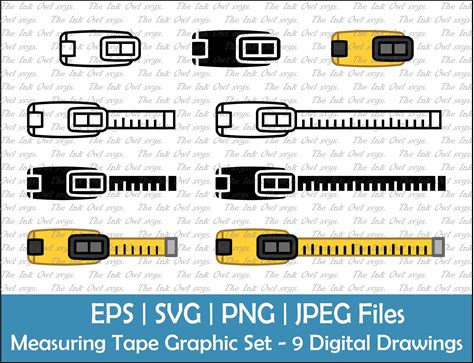 Measuring Tape From Above Vector Clipart Set / Outline & Stamp Graphic / Adjustable Ruler Contractor Tools / PNG, JPG, SVG, Eps