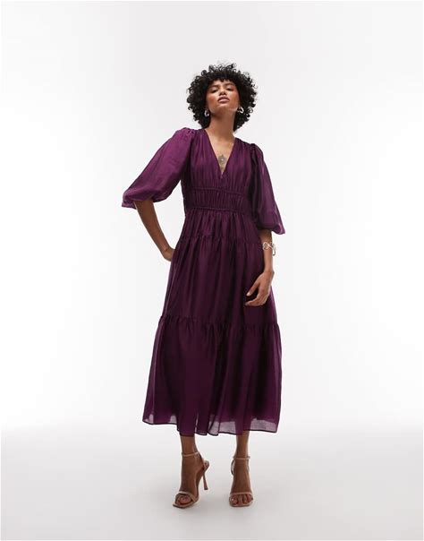 & Other Stories Midaxi Dress With Volume Sleeves And Shirred Bodice In Berry Burgundy-Purple - Purple (Size: XS)
