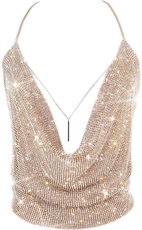 Gold Sexy Tops For Women Sparkly Deep V Neck Crop Tank Tops Cami Body Chain Top