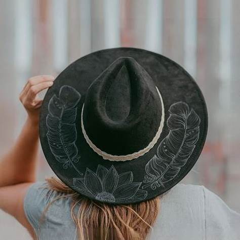 Burned Hat With Pyrography Feather And Sunflower Design | Wide Brim Or Cowboy Style