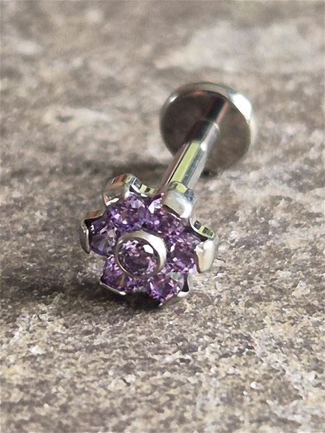 Gem Flower Stud Internally Thread Tragus Helix Conch Philtrum Labret Titanium Hypoallergenic Purple 16G