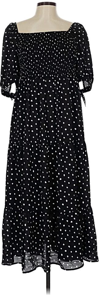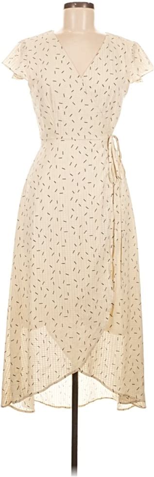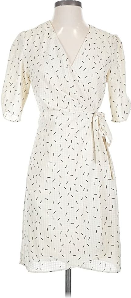 Mod Ref Casual Dress - Wrap Tie Neck Short Sleeve: Ivory Polka Dots Pattern Dresses - Women's Size Medium