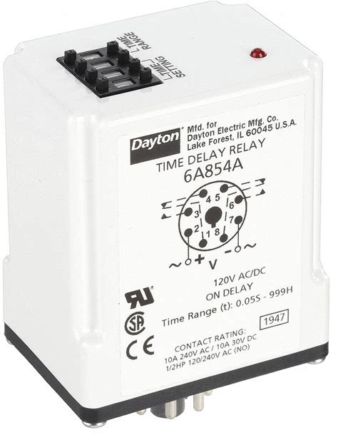 Dayton Single Function Time Delay Relay: Socket Mounted, 12V DC, 10 A, 8 Pins/Terminals, On Delay Model: 24EP02