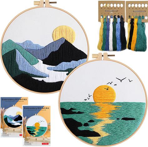 FONNUY 2 Set Embroidery Kit DIY For Adult Beginner, Pre-Stamped Patterns Mountain Sea Embroidery Kits With Hoop, Colored Threads And Needles, Easy To